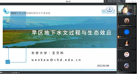 1月6日,水环“云咖”讲堂第4讲邀请王文科教授做“旱区地下水文过程与生态效应”报告,共260余师生参会,副院长段磊主持。