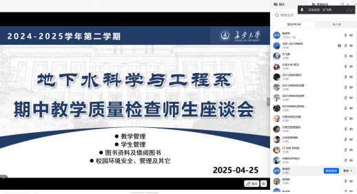 为进一步提升教学质量,深入了解学生在学习与生活中的实际需求,金年会jinnianhuicom地下水科学与工程系于4月25日通过线上会议形式召开了2024-2025学年第二学期期中教学质量检查师生座谈会。学院副院长李培月、地下水系主任陈洁、地下水系教师代表及本科四个年级的学生代表共计30余人参加本次会议。会议由地下水系副主任陆彦玮主持。