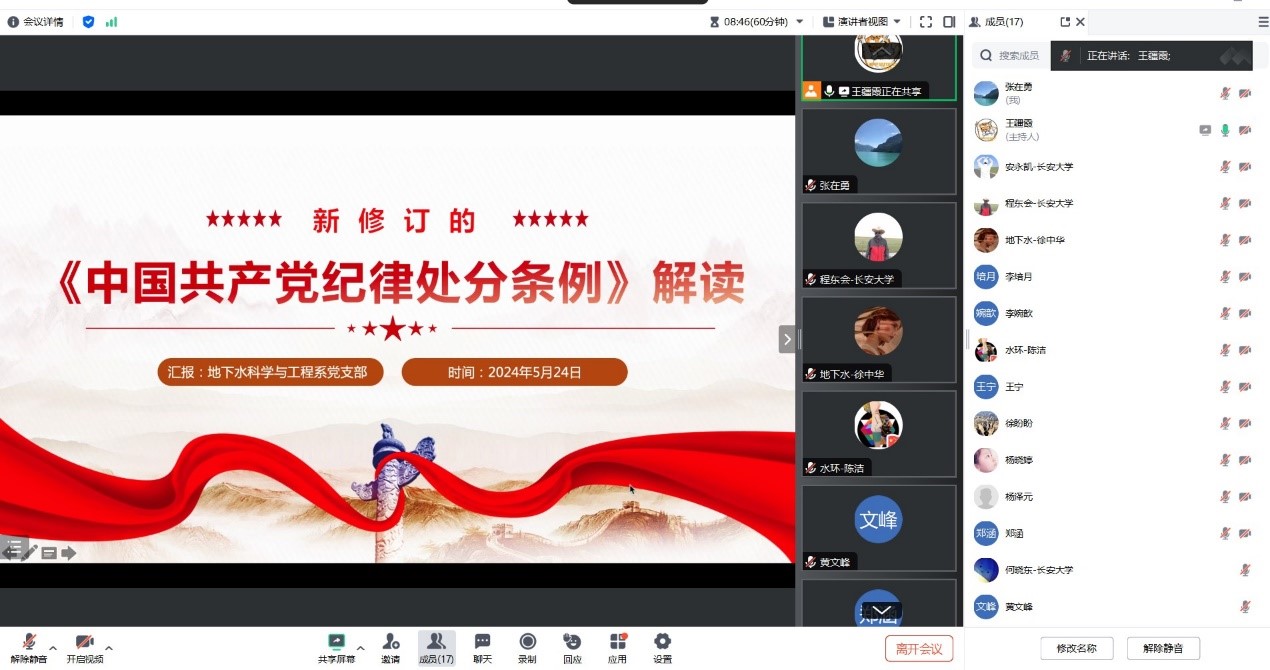 2024年5月24日,地下水科学与工程系召开全体党员大会,开展专题学习。党支部书记王疆霞以“《中国共产党纪律处分条例》解读”为题讲授专题党课,从《条例》修订的主要内容及其鲜明特征、新修订的《条例》对于推动全面从严治党向纵深发展的重要意义、抓好新修订的《条例》的贯彻执行三个方面进行讲解。通过细致解读,进一步教育引导全体党员加强纪律意识,严守政治纪律和政治规矩,立身廉明,砥砺担当,干净忠诚。