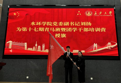 刘扬为第十六期青马班优秀学员颁发证书,并为第十七期青马班暨团学干部培训营授旗。