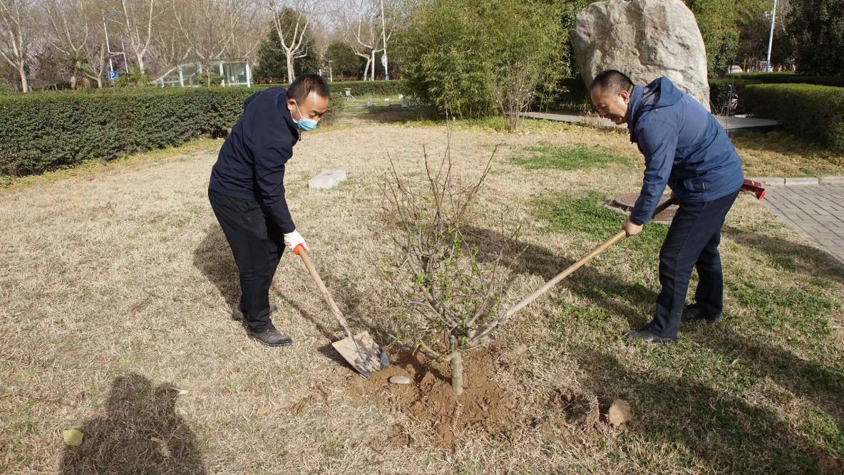 学院教职工积极参与此次活动,大家劳动激情高涨,手持铁锹和水桶,将一颗颗充满生机和希望的树苗植入土中。