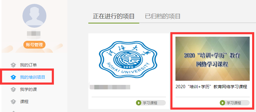 1、找到培训项目:缴费成功后系统直接跳转至学员个人空间,点击左侧菜单中的“我的培训项目”,即可看到报名的培训项目;