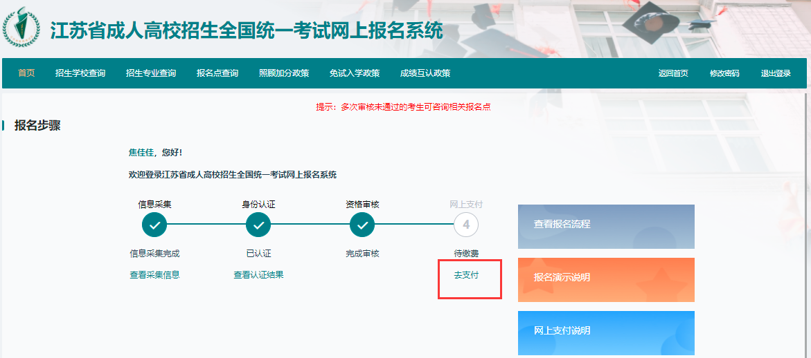 特殊类考生(医学类、免试生、照顾加分、专升本学历认证未通过、没有身份证的考生)在线认证未通过的考生需要持相关审核材料进行现场认证。普通考生及资格审核通过的考生可直接进行支付。上传材料后请等待管理员审核意见,再进行下一步操作,认证通过的考生可进入下一步进行支付,认证不通过的考生耐心等待管理员审核意见;如多次审核不通过可联系报名点。