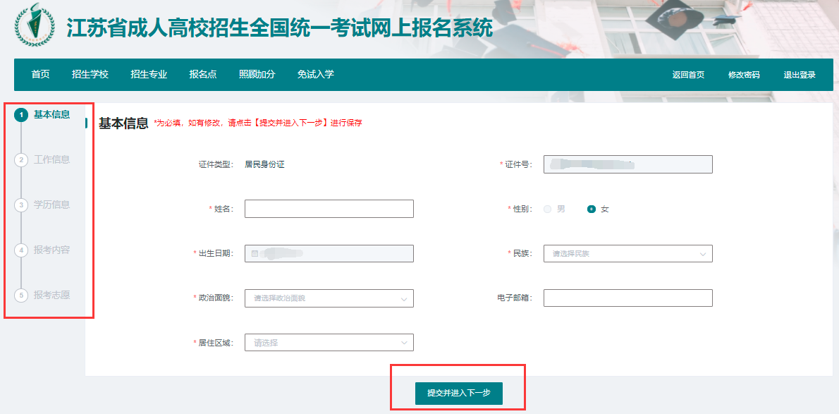 登录成功后,进入到报名页面,如下图。点击【去填写】,进入到报名信息填写页面,如下图。填写好基本信息页面中全部必填项(*)内容后,点击【提交并进入下一步】,进入到下一模块的填写,依次填写好工作信息、学历信息、报考内容、报考志愿页面内容。