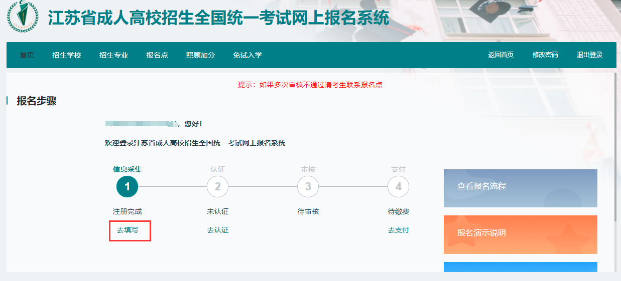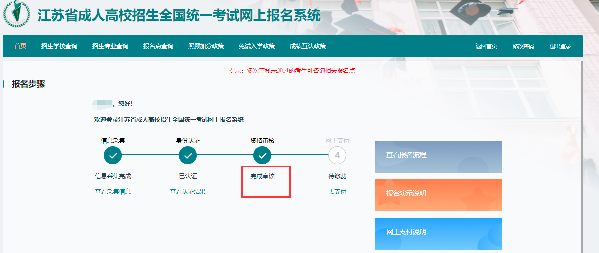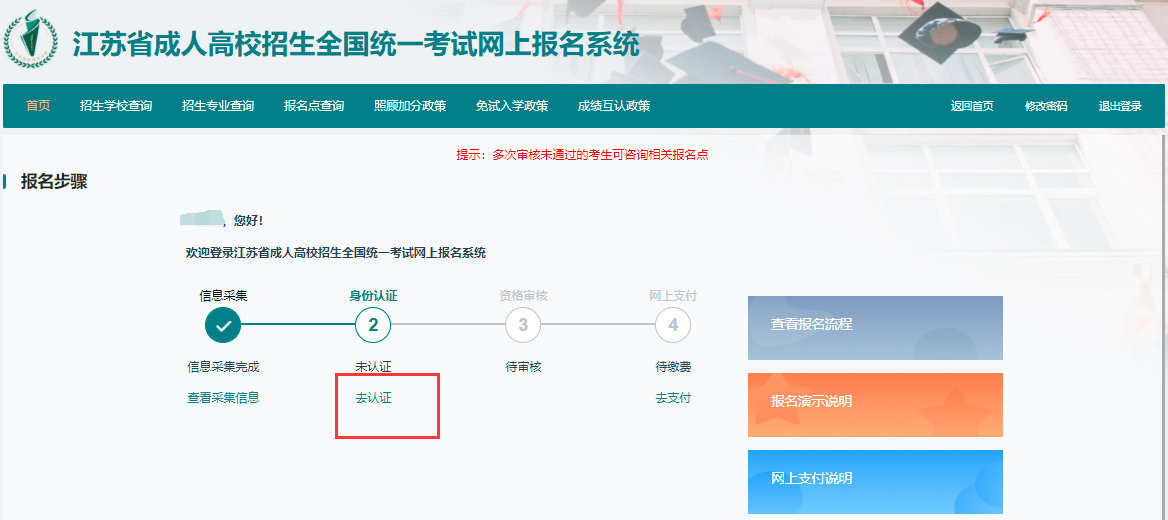特殊类考生(医学类、免试生、照顾加分、专升本学历认证未通过、没有身份证的考生)在线认证未通过的考生需要持相关审核材料进行现场认证。普通考生及资格审核通过的考生可直接进行支付。上传材料后请等待管理员审核意见,再进行下一步操作,认证通过的考生可进入下一步进行支付,认证不通过的考生耐心等待管理员审核意见;如多次审核不通过可联系报名点。