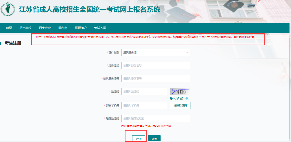 提示:无身份证请联系‘现场报名点’,若发送2次密码或长时间接收不到短信,请先稍等片刻直接收到短信(通讯正常后)再重试,如手机无法收到短信验证码,有可能短信被拦截。