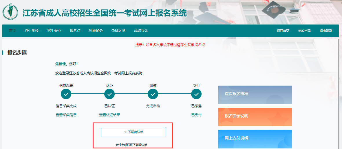 考生报名完成后且已交费的考生可在报名步骤页面点击【下载确认单】进行确认单下载。