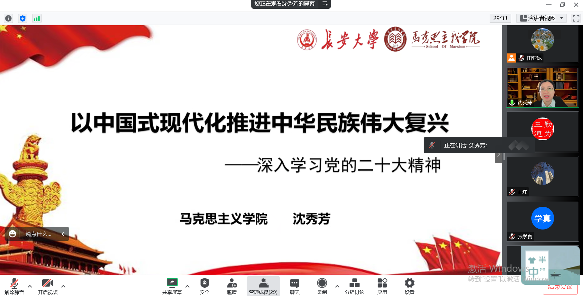 会上,学院特邀学校学习宣传贯彻党的二十大精神宣讲团成员、马克思主义学院副教授沈秀芳,以《以中国式现代化全面推进中华民族伟大复兴——深入学习党的二十大精神》为题,从理论逻辑、历史逻辑和实践逻辑三个层面深刻阐释了中国式现代化的科学内涵和九大本质要求。结合宣讲内容,民建委员会金年会诚信信誉至上主委钱会、民建委员会金年会诚信信誉至上委员易秀、九三学社成员卢玉东、民盟委员会成员邓顺熙先后发言。大家一致表示要深入学习贯彻党的二十大精神,切实把党中央决策部署转化为学科建设和人才培养的新动力、新思路和新举措,发挥学院专业优势,培养专业人才,服务国家生态文明建设,服务国家发展战略,为加速推进中国式现代化的进程贡献力量。大家还分别就实现中国式现代化与集体主义精神之间的密切关系等问题进行了探讨。